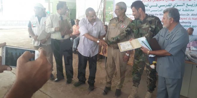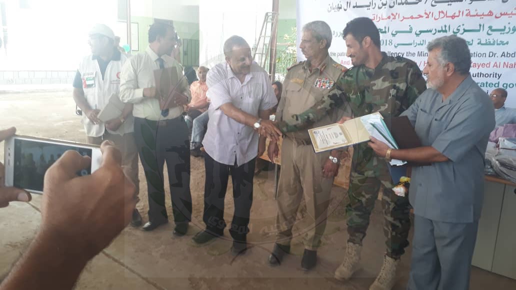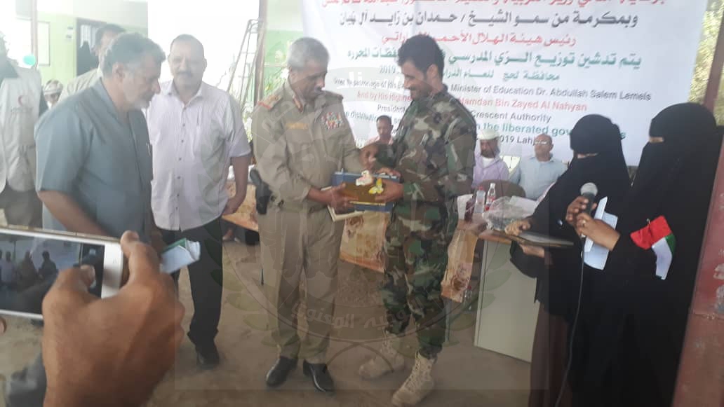 جاء ذلك خلال تدشين الهلال الأحمر الإماراتي، توزيع الزي المدرسي في محافظة لحج، للعام الدراسي 2018 – 2019، وبحضور قيادة محافظة لحج ممثلة بمحافظ المحافظة اللواء ركن “أحمد عبدالله التركي”، وقائد قوات الحزام الأمني بالمحافظة “جلال الربيعي”، ومدير عام التربية والتعليم في المحافظة “د. محمد الزوعري”.