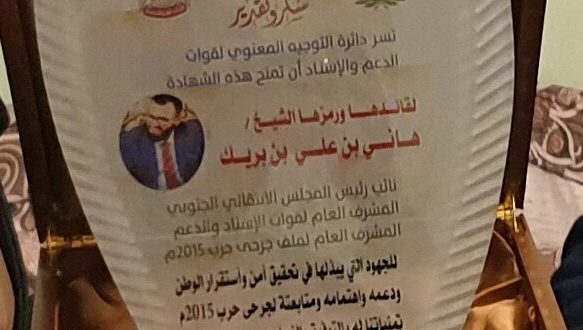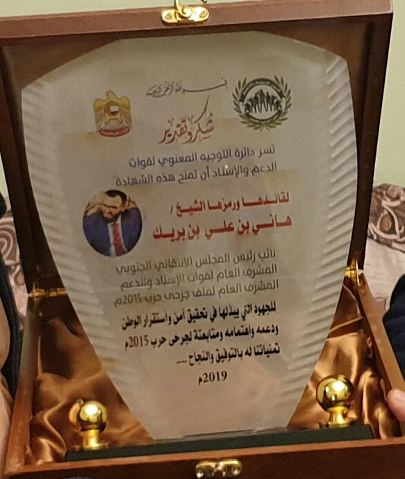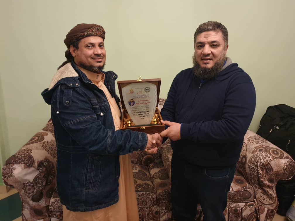 حيث قدمت لهم الدروع والشهائد التقديرية تقديرا وعرفانا لادوارهم الاخوي والإنساني، حيث سلمت الشهادات التقديرية للاخ جمال مفتاح المصري نيابة عن الشيخ هاني بن بريك.