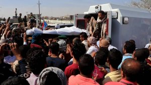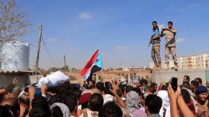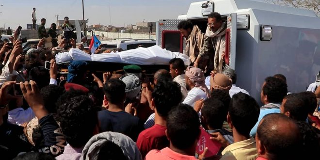 شيع الالاف بينهم مسؤولون عسكريون وامنيون ومدنيون ظهر اليوم بالعاصمة عدن جثمان الشهيد اللواء الركن “محمد صالح عبدالكريم طماح” قائد الاستخبارات العسكرية والاستطلاع والذي استشهد أول من أمس متأثرا بجراحه جراء إصابته بتفجير منصة العروض في قاعدة العند العسكرية.