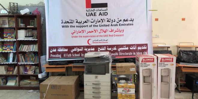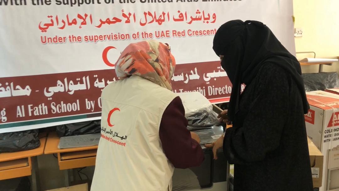 الهلال الأحمر الإماراتي يقدّم أدوات مكتبية لمدرسة الفتح بعدن