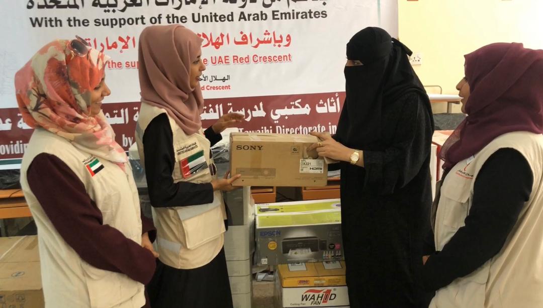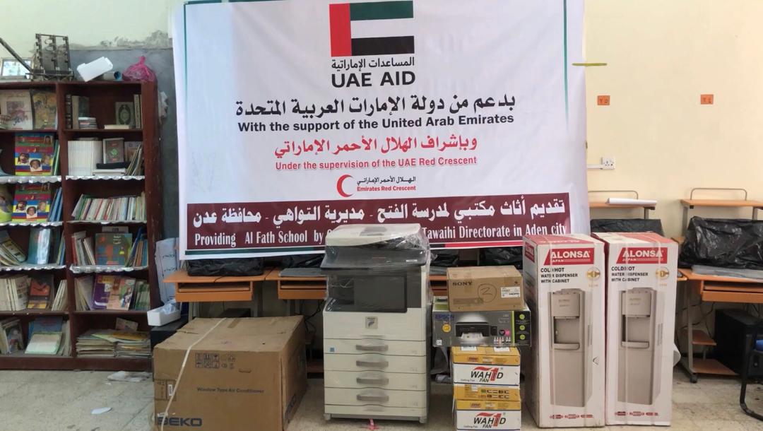 في إطار دعم العملية التعليمية في المحافظات المحررة.. استجابت هيئة الهلال الأحمر الإماراتي لنداء إدارة مدرسة الفتح بمنطقة التواهي محافظة عدن وقدمت لهم أثاث وأدوات مكتبية.