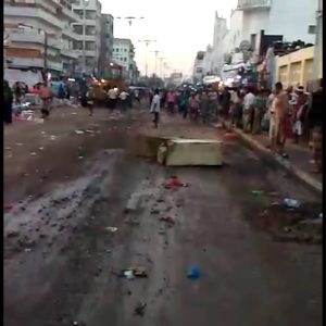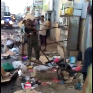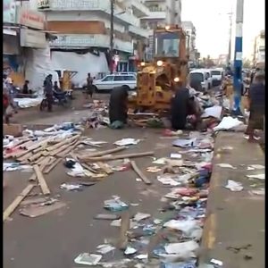 القطاع الثامن للحزام الأمني وعمال النظافة يرفعون اكوام القمامة من شوارع مديرية الشيخ عثمان عقب انتهاء النشاط التجاري