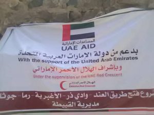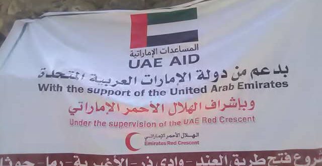 دشن الهلال الأحمر الإماراتي مشروع فتح الطريق ( العند ـ ذر ـ الاغبري ـ الرماة ) بمديرية القبيطة محافظة لحج والتي تضررت جراء الأمطار الغزيرة التي شهدتها المديرية خلال الأسبوع الماضي ، وذلك ضمن حملة الاستجابة العاجلة التي اطلقتها دولة الإمارات لإغاثة متضرري السيول في اليمن .