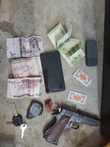اما المتهم الآخر (م. م. ع ) فقد عثر بحوزته على جوال نوكيا ومسدس امريكي قبضة اليد حمراء بالإضافة الى حافظه يوجد بداخلها نسخ بطائق شخصيه طبق الأصل وصور عسكرية.
