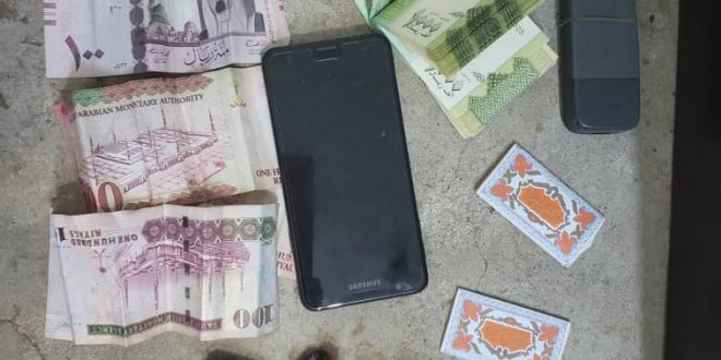 كما عثر افراد النقطة بحوزته أيضا على ورق لف حشيش ومبلغ مالي وقدرة أربعمائة ريال سعودي ومبلغ سته وعشرون الف ريال يمني وجوال جلاكسي .