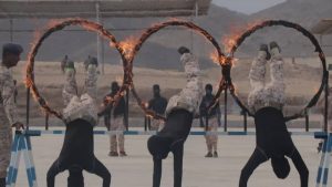 والمتوسط ،والهجوم على العدو ،والرمي بالذخيرة الحيه” كما تم الاستعراض باالاطقم العسكرية .