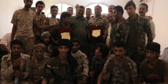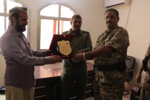 حيث قاما كلا من مديرأمن لحج العميد صالح السيد والعلاقات العامة بألوية الدعم والإسناد وضاح قاسم ، بتكريم القائدين بتوجبهات قوات التحالف والدعم والإسناد.