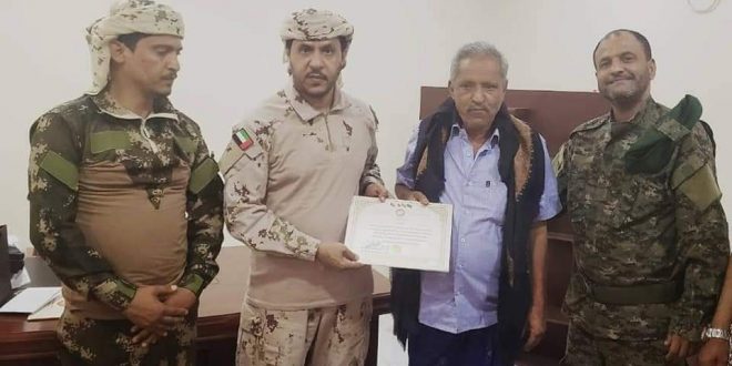 كرم قائد التحالف العربي بعدن العميد راشد القفلي “ابو محمد”ابو الشهداء الثلاثة المناضل الصلب القائد يحيى محمد مثنى الشوبجي تقديرا للتضحيات الجسيمة التي قدمتها أسرة الشوبجي في الدفاع عن الدين والأرض والعرض والتصدي للمليشيات الحوثية والذي قدم ثلاثة من اولاده الابطال هم شلال ،ومازن،وانور .