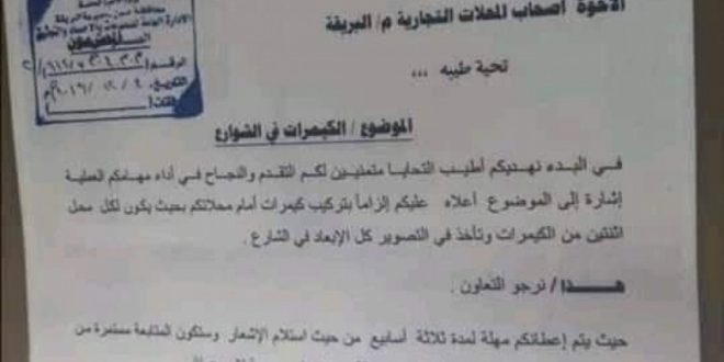 وقالت وثيقة تم تعميمها من قبل اللواء الاول على المحلات التجارية ان عليهم الزاما تركيب كاميرات مراقبة وتكون كامرتين لكل محل تأخذ كل الابعاد في الشوارع .
