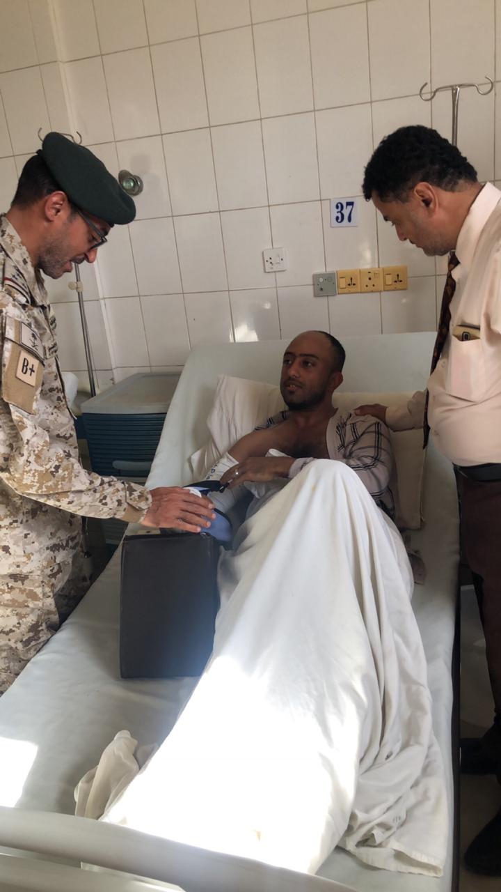 الى ذلك استمع قائد التحالف في عدن خلال زيارته لاحاديث المصابين وذويهم عن مستوى الخدمات العلاجية التي تقدم لهم ، فيما قدم الأطباء شرحًا مفصلًا عن الوضع الصحي للمصابين .