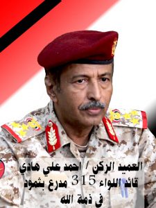 ببالغ الأسى وعميق الألم تلقينا نبأ وفاة العميد ركن أحمد علي هادي قائد اللواء 315 مدرع، بمديرية ثمود محافظة حضرموت ، مدير مكتبكم الأسبق الذي انتقل إلى جوار ربه اثر نوبة قلبية حادة ..
