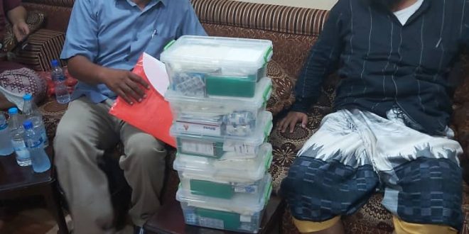 حيث قام العميد وضاح قاسم مدير العلاقات بتسليم صناديق الإسعاف إلى مدير الدائرة الصحيةالدكتور عارف الداعري في مقر الدائرة بمستشفى الجمهورية بخور مكسر .