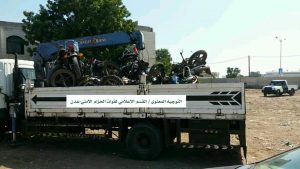 وضبطت القوات الأمنية خلال الحملة العديد من الدراجات المخالفة لقرار منع الدراجات الذي كانت قد أقرته السلطات الأمنية بالعاصمة عدن في وقت سابق.