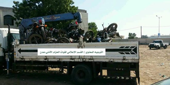 الحزام الأمني يشن حملة واسعة لضبط الدراجات النارية في العاصمة عدن
