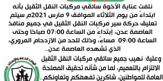 وجاء في التعميم أنه ابتداءً من يوم الثلاثاء الموافق 9 مارس 2021م سيتم تعليق حركة سير مركبات النقل الثقيل في جميع منافذ العاصمة عدن، إبتداءً من الساعة 07:00 صباحًا وحتى الساعة 09:00 مساءً، وذلك للحد من الاختناق المروري، الذي تشهده العاصمة عدن..