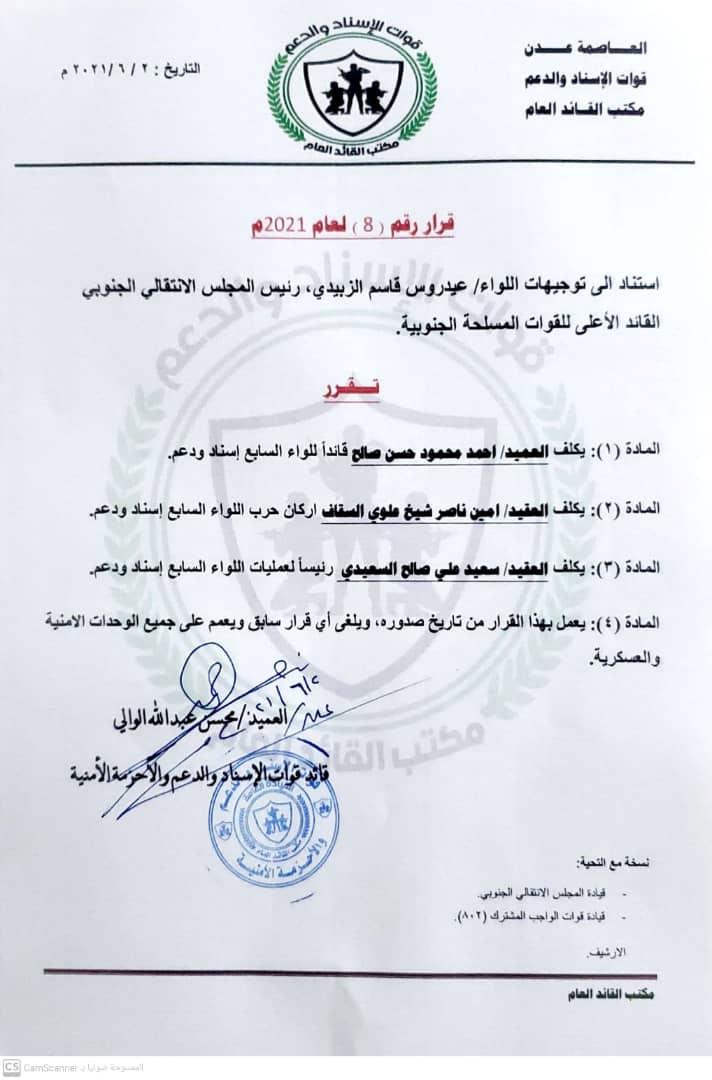 وبحسب والوثيقة التي نشرها المركز الإعلامي للقوات، تؤكد صدور قرار رقم(8) لعام 2021م بشأن تكليف العميد احمد محمود حسن صالح قائدا للواء السابع دعم وإسناد، والعقيد أمين ناصر شيخ علوي السقاف ، اركانا له.