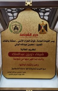 حيث تقدمت دائرة العلاقات العامة بقيادة وضاح قاسم بتكريم الطالبة شيماء باالنيابة عن العميد “الوالي”، معبرا عن افتخاره وكافة أبناء الجنوب بها وشجاعتها وحبها لوطنها الجنوب.
