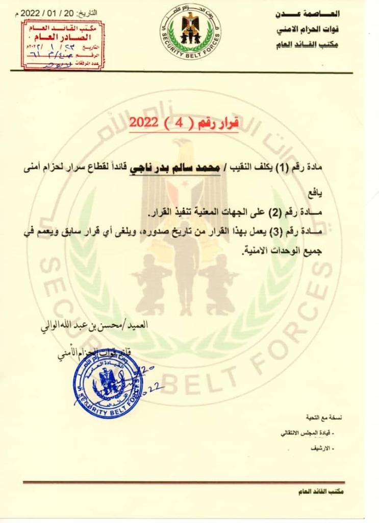 كما نص القرار رقم 4 لعام 2022م تكليف النقيب محمد سالم بدر قائداً لقطاع سرار .