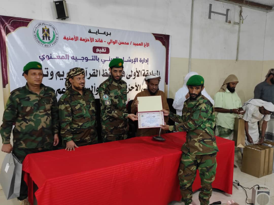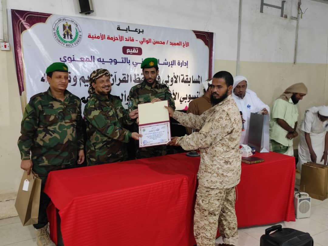 وتنافس أكثر من عشرون حافظاً للقرآن الكريم على المركز الأول ثلاث فئات ( حفاظ المصحف كاملا، وحفاظ 15 جزء، وحفاظ 5 أجزاء ) في المسابقة الاولى التي اقامتها إدراة الإرشاد الديني، بدائرة التوجيه المعنوي لقوات الحزام الأمني.