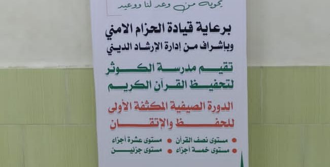 حيث تقيم مدرسة الكوثر في مديريةالشيخ عثمان دورة صيفية لحفظ القرآن الكريم واتقانه، لعدة مستويات، تحت اشراف إدارة الارشاد الديني بالتوجيه المعنوي لقوات الحزام الأمني.