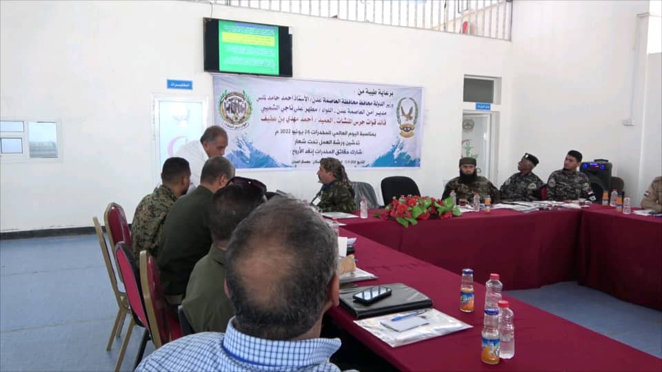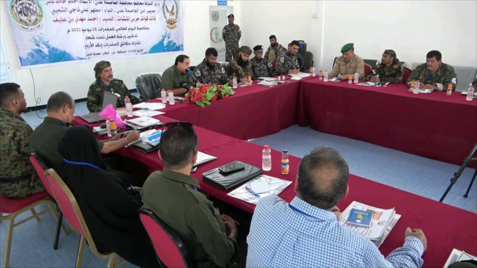 دشنت العاصمة عدن صباح اليوم الأحد، ورشة عمل خاصة بتفشي ظاهرة المخدرات ومكافحتها، وذلك برعاية من محافظ محافظة عدن وزير الدولة، الاستاذ احمد حامد لملس ومدير أمن شرطة عدن اللواء الركن مطهر علي ناجي وقائد حزام المنشآت، العميد أحمد العفيف.