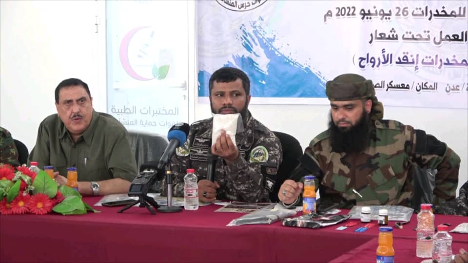 من جانبه، تحدث العميد أحمد العفيف قائد حزام المنشأت عن ظاهره المخدرات والحد من إنتشارها قائلاً : “المخدرات المنتشرة بعدن الهدف منها هو تدمير الشباب الذين هم عماد المستقبل فالعدو يحاول على استهداف شبابنا بهذه الطرق الخبيثه التي تعتبر سلاح مدمر وخطير”.