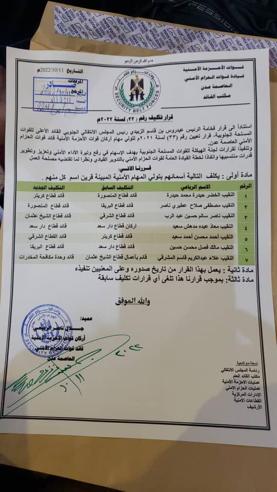 أصدر إركان قوات الحزام الأمني, قائد حزام عدن العميد جلال ناصر الربيعي أمراً إداريا قضى بعدد من التكليفات في قطاعات قوات الحزام الأمني بالعاصمة عدن،وكذا إنشاء وحدة لمكافحة المخدرات وتعيين قائدا لها,استناداً إلى قرار الرئيس القائد عيدروس قاسم الزُبيدي رئيس المجلس الانتقالي الجنوبي, القائد الاعلى للقوات المسلحة الجنوبية, وتنفيذا لقرارات لجنة الهيكلة للقوات المسلحة الجنوبية بهدف الإسهام في رفع وتيرة الاداء الأمني وتعزيز وتطوير قدرات منتسبيها وانفاذا لخطة القيادة العامة لقوات الحزام الإمني بالتدوير القيادي نظرا لما تقتضيه مصلحة العمل.