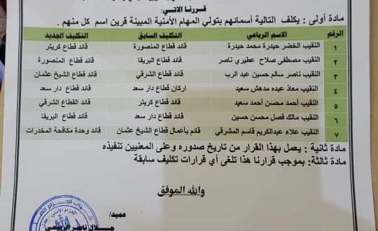 وشملت القرارات التي حملت رقم (32) لسنة 2022م، وقضت المادة الأولى منه بتكليف التالية اسماءهم بتولي المهام الأمنية المبينة قرين اسم كل منهم :