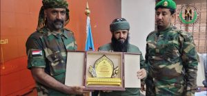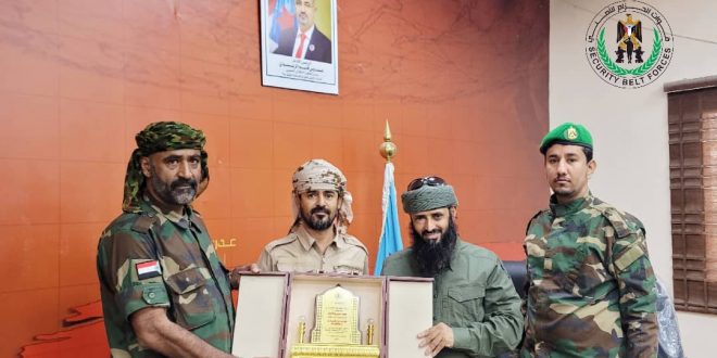 كرم القائد العام لقوات الحزام الأمني العميد محسن عبدالله الوالي اليوم في مقر القيادة بمعسكر الشعب قائد وضباط الكتيبة الرابعة احتياط القائد العام ، التي تتولى حماية اصلاحية المنصورة بالعاصمة عدن.