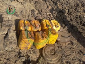 عثرت قوات الحزام الأمني الساحل محافظة أبين، على عبوتين ناسفتين في وادي مريب غرب مدينة شقرة.