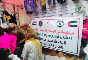 وثمنت اسر شهداء حزام ابين الدعم السخي واللفتة الإنسانية الكريمة من دولة الامارات العربية المتحدة عبر ذراعها الانساني الهلال الاحمر،الذي لامس همومهم ومعاناتهم وخفف اعباء كسوة ابناءهم مع اقتراب عيد الفطر المبارك .