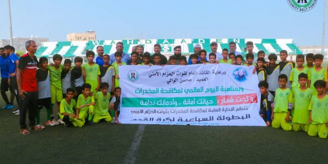 وفي اجواء حماسية رائعة استضاف ملعب نادي وحدة عدن البطولة، وزينت جنبات الملعب اللافتات والشعارات التي تحذر من خطر المخدرات، وكذلك ارتداء لاعبوا الفرق تشرتات حملت شعارات الحزام وكتابات “لا للمخدرات”، وانطلقت المباراة الافتتاحية.بين فريقي الجلاء والجزيرة انتهت المباراة بفوز الجزيرة 1/4,وفي المباراة الثانية التقى النصر بفريق الروضة والتي انتهت بفوز فريق الروضة 3/صفر ليتأهل الجزيرة والروضة الى المباراة النهائية ، وتعادل الفريقين في الشوطين صفر/صفر الا ان فريق الروضة احرز ضربتين ركنيتين كانت كفيلة بمنحه لقب البطولة .
