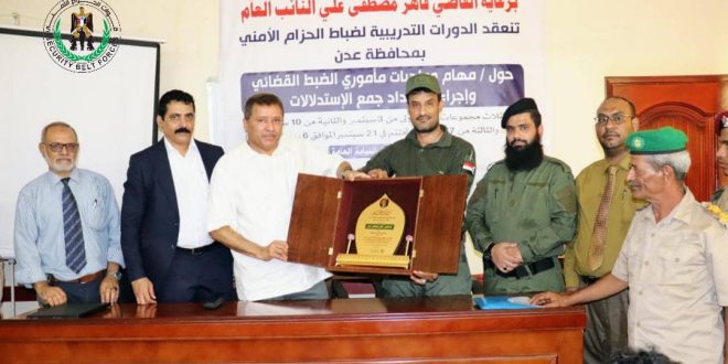 من جانبه أشاد العميد جلال ناصر الربيعي أركان قوات الحزام الأمني، قائد قوات الحزام الأمني بعدن بمعالي النائب العام القاضي قاهر مصطفى وحرصه على رفع كفاءة ضباط الحزام الأمني على المستوى العلمي والعملي من خلال برنامج تدريبي متكامل.