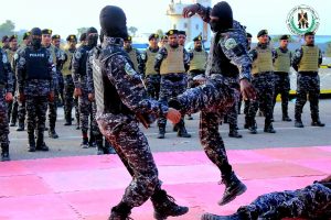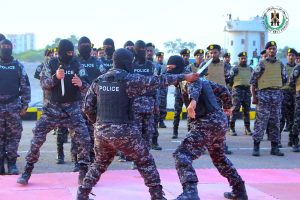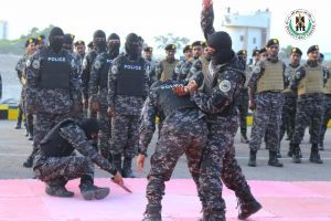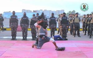 وقدم المتخرجون من الدفعة الثامنة عرضًا عسكريًا مهيبًا، تضمن عددًا من الفقرات الفنية للتعامل مع مثيري الفوضى والاخلال بأمن المرافق والمؤسسات الحكومية.