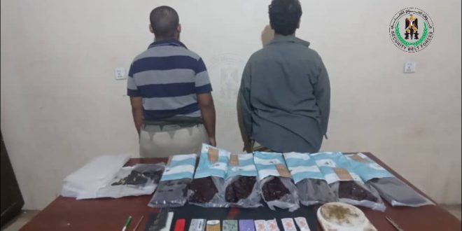 تمكنت قوات الحزام الأمني العاصمة عدن, اليوم من إلقاء القبض على شخصين اثنين متهمين بترويج المخدرات وبحوزتهما 7 كيلو جرام ونصف من مادة الحشيش المخدر في مديرية الشيخ عثمان.