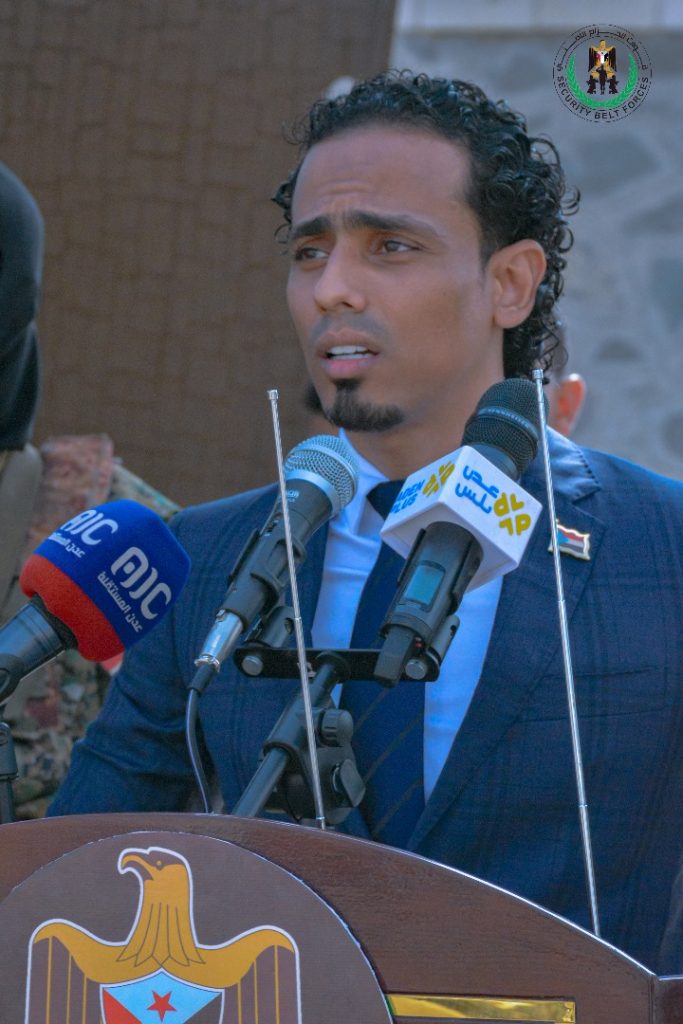 وفي كلمة ألقاها خلال حفل التخرج، حيا مؤمن السقاف عضو هيئة رئاسة المجلس الانتقالي الجنوبي، رئيس تنفيذية انتقالي العاصمة عدن، الخريجين من الدورة التاسعة (استجداد) لقوات حزام عدن، والتي تأتي ضمن خطة العام التدريبي الحالي، ناقلا لهم تحيات القيادة السياسية ممثلةً بالرئيس القائد عيدروس قاسم الزُّبيدي, رئيس للمجلس الاننقالي الجنوبي, القائد الاعلى للقوات المسلحة الجنوبية.