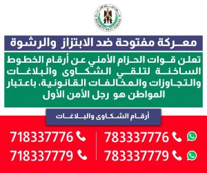 تحت شعار معركة مفتوحة ضد الابتزاز والرشوة، أعلنت قوات الحزام الأمني عن أرقام الخطوط الساخنة؛ لتلقي الشكاوي والبلاغات عن التجاوزات والمخالفات القانونية.
