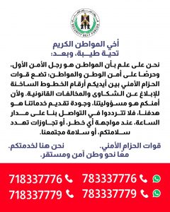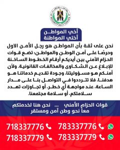وقالت قوات الحزام الأمني في إعلانها: نحن نعلم بأن المواطن هو رجل الأمن الأول؛ وحرصًا على أمن الوطن والمواطن، نضع بين أيديكم أرقام الخطوط الساخنة؛ للإبلاغ عن الشكاوي والمخالفات القانونية.