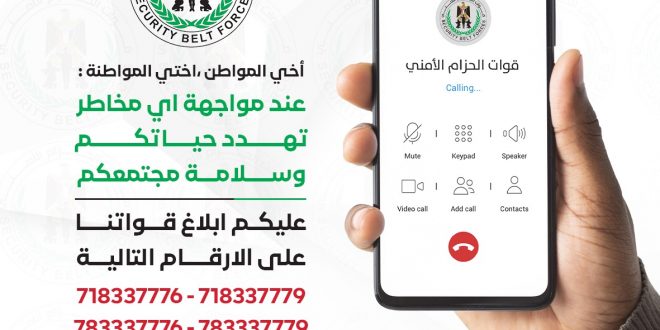 الحزام الأمني يعلن أرقام الخطوط الساخنة؛ لتلقي شكاوي المخالفات القانونية والابتزاز والرشوة