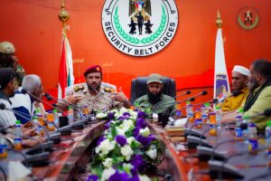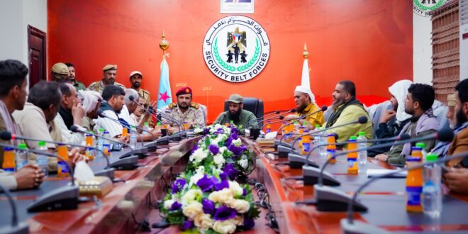 التقى العميد محسن الوالي، القائد العام لقوات الحزام الأمني، والعميد نبيل المشوشي، أركان ألوية الدعم والإسناد وقائد اللواء الثالث، بعدد من مشايخ وأعيان وشخصيات اجتماعية من أبناء مديرية مودية بمحافظة أبين، وذلك في العاصمة عدن، لمناقشة الأوضاع الأمنية والتحديات المرتبطة بمكافحة الإرهاب،بحضور الشيخ جمال العاقل، والشيخ صالح المجعلي والعميد لؤي الزامكي، قائد اللواء الثالث حماية رئاسية.