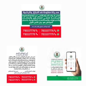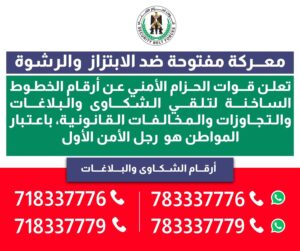 أعادت قوات الحزام الأمني، اليوم، اعادة نشر أرقام الخطوط الساخنة المخصصة لتلقي البلاغات والشكاوى المتعلقة بحالات الابتزاز، والرشوة، والمخالفات القانونية، التي اعلنت عنها في وقت سابق، وذلك في إطار حملة شاملة تحت شعار: “معركة مفتوحة ضد الابتزاز والرشوة”.
