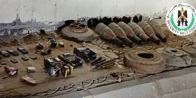 عثرت قوات الحزام الأمني في العاصمة عدن، اليوم، على عدد من العبوات الناسفة والمتفجرات المعدّة للتفجير، وذلك خلال تنفيذ دورية أمنية راجلة تابعة للقطاع الشرقي في مديرية خور مكسر.