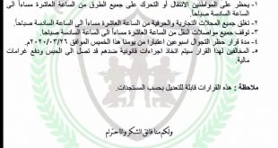 قوات الدعم والإسناد تقر حظر التجوال ابتداءً من اليوم بالعاصمة عدن عدن / القسم الإعلامي / خاص: اصدرت قيادة الدعم والإسناد ممثلة بالعميد محسن الوالي قرار حظر تجوال المواطنين في العاصمة عدن للحفاظ على سلامتهم ودرءا لأي تداعيات محتملة لفيروس كورنا المستجد . وفي تعميم لقيادة الدعم والإسناد اقرت حظر تجوال المواطنين من الساعة العاشرة مساءً وحتى السادسة صباحا ابتداءً …