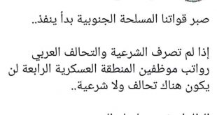 بيان أمني هام صادر عن قيادة لواء العاصفة بالعاصمة عدن بشأن التطورات والأحداث الإجرامية الأخيرة التي أقدمت عليها عناصر خارجة عن النظام والقانون في مديريتي الشيخ عثمان ودار سعد . يقول تعالى في محكم أياته ( الَّذِي أَطْعَمَهُم مِّن جُوعٍ وَآمَنَهُم مِّنْ خَوْفٍ [4] ) صدق الله العظيم . إستمرارا للدور المناط بقيادة لواء العاصفة بكافة منتسبيه من الضباط والصف …